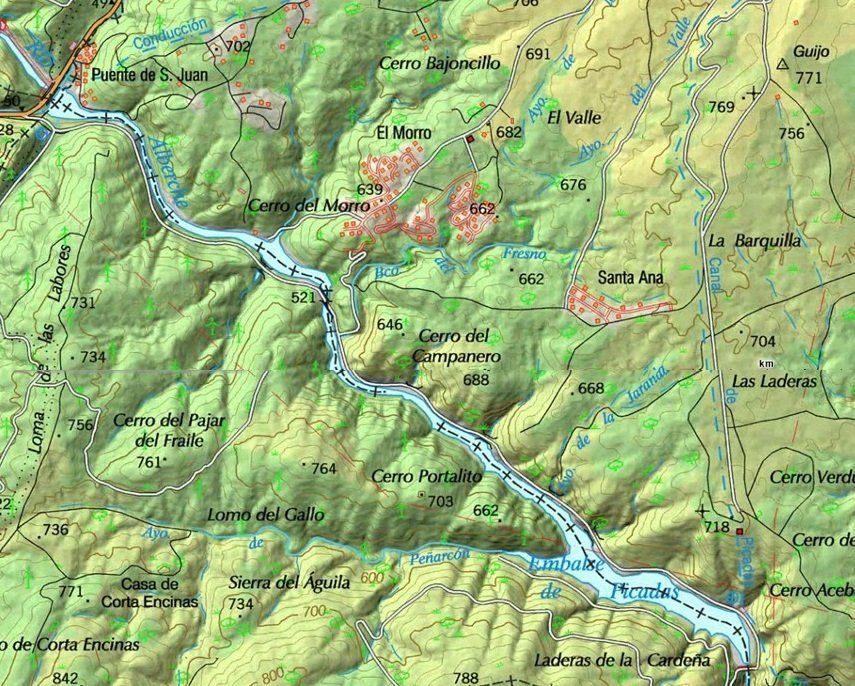 Este pequeño embalse, construido en el año 1.952, tiene una superficie de 92 hectáreas y una capacidad de 15 hectómetros cúbicos. Sus aguas se emplean para abastecimiento, riego y generación eléctrica, además de con fines recreativos, y aunque no está permitido el baño, si está permitida la navegación a remo. Se encuentra en el término municipal de Navas del Rey y sus muros embalsan las aguas del río Alberche. Apenas sufre variaciones de nivel y sus aguas son extremadamente frías pues provienen de las turbinas situadas en la parte más profunda del muro de la presa del embalse de San Juan, río arriba. Estas contienen buenas poblaciones de barbo, boga, carpa, lucio, black bass y lucio perca, que se pueden pescar durante todo el año si disponemos de la licencia de pesca en vigor de la Comunidad de Madrid, pero las bajas temperaturas de sus aguas nos van a obligar a esperar a la llegada del calor para conseguir resultados. Por sus orillas discurre la plataforma de la vía abandonada de un ferrocaril de vía estrecha que nunca llegó a funcionar. Este tren pretendía unir la línea Madrid - Almorox con el oeste peninsular a través del valle del Tietar. El tren se llegó a inaugurar cuando se enlazó por vía, San Martín y Pelayos de la Presa. Para la inauguración se trajo una locomotora, se sacaron las fotografías y el ferrocarril volvió a Madrid por donde había venido, por la carretera. Una suerte para los pescadores, que ahora podemos recorrer cómodamente sus orillas.